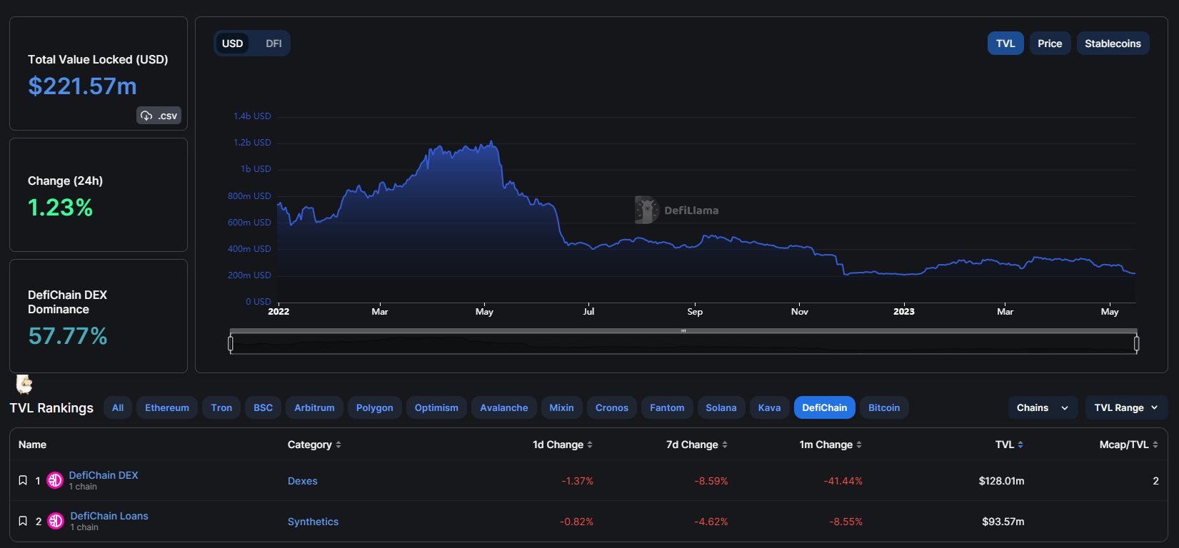 据 DefiLlama 资料显示,现阶段 DeFiChain TVL 大约为 2.21 亿美金。DFI 是 DeFiChain 平台原生 Token,可用于购买 DeFiChain 的网络花费,获得贷款利率,并参加整治。平台无需许可,所有人都可以参加其生态系统。