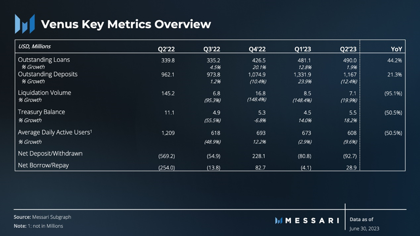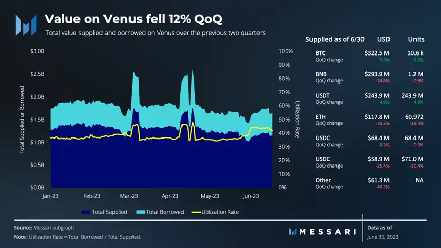 Venus 里的总供货价值在第二季度下降 12%,虽然大部分加密资产的价钱保持相对稳定。这主要是归功于 BNB 价格下降 32%,主要是因为美国证券交易委员会对于不同币安网实体线明确提出 13 项民事诉讼控告。这一管控行为的危害使 Venus 所持有的资产净值降低,除开 BTC、XVS、CAKE、ADA 和 MATIC 以外,等非稳定币财产均出现了排出状况。
