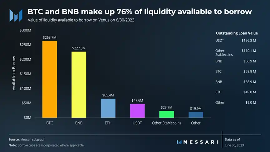 一季度结束后,价值为 6.47 亿美金的流动性仍能够借出去,在其中 BTC 和 BNB 共占到总意义的 76%。稳定币高使用率主要来源于 BSC Token Hub 网络攻击占有的超额交易头寸,该交易头寸约占未偿还 USDT 债务 59% 和 USDC 债务 64%。