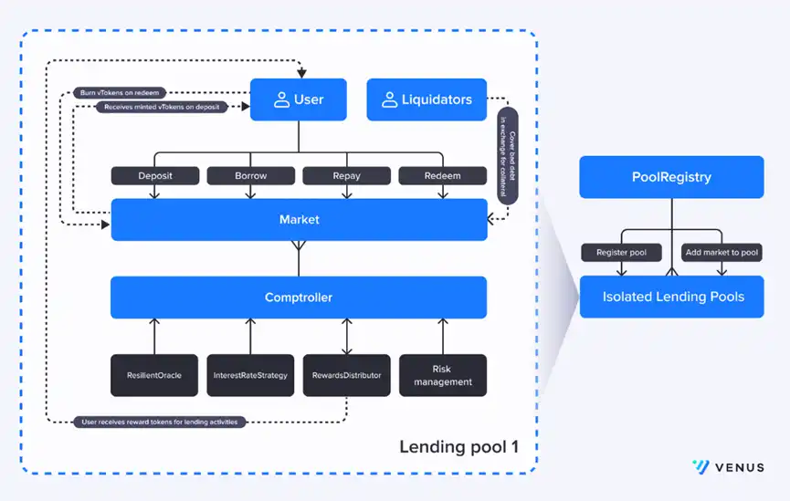 Venus 是一个基于 BNB 链的去中心化金融市场协议书,用以存款和贷款各种各样加密资产。这些资产的利息是根据年利率实体模型以优化算法方法设置的,该方法依据存进资产借出去占比开启升级。该协议由 VenusDAO 社区治理,然后由 XVS 货币进行治理。客户能将治理代币质押贷款在保鲜库中,参加整治并得到协议书收入一部分。