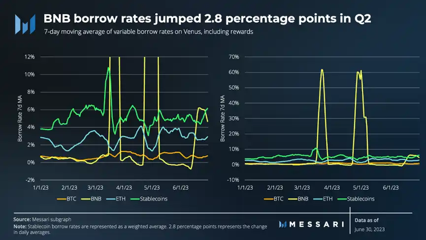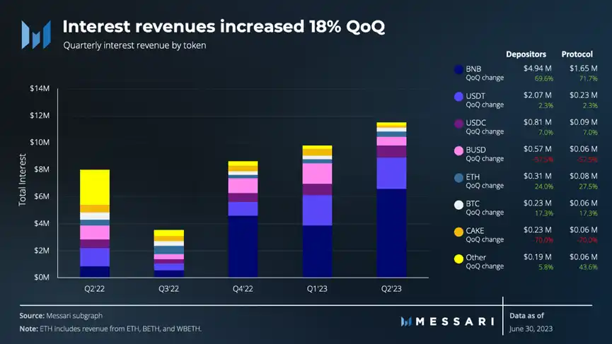 虽然遭遇这些挑战,该协议持续第四个一季度完成了收入增加,做到 1150 万美金。这类提高能够归功于银行利率调整和相对敏感度低于利率变化的借贷活动内容。第二季度结束后,总额为 6.47 亿美金的流动性仍能够借出去,在其中 BTC 和 BNB 占据着主导性。