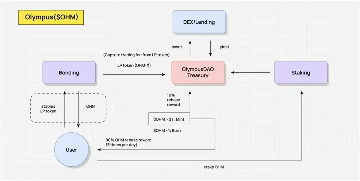 如下图所示,Olympus 中 OHM 的激励主要有两种方式:一种为债券机制 (Bonding),另一种为质押 (Staking) 机制。Olympus 官方以债券形式将 OHM 低于市场价格卖给用户,官方获得用户支付的 USDC、ETH 等资产,使得国库得到价值资产支撑,并生成 OHM 通过 Rebase 机制分配给 OHM 质押者。理想状态下只要用户都选择长期质押,也就是所谓 (Stake,Stake)——即(3,3),其仓位内的 OHM 余额就可以不断复利增长,质押者拥有高额 APR 的正向循环效应。但如果二级市场上的 OHM 抛压严重,这种飞轮就无法持续。这当然是一种博弈游戏,理想状态是纳什均衡,达到双赢。