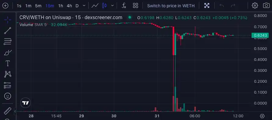 非正常情况下,因为 CRV 的链上流通性贮备无法合理承揽集中化买盘,今天早晨 CRV 在各个 DEX 上的交易价格均出现了异常波动,同时在 3:05 至 3:15 期内,Uniswap 上 CRV/WETH 买卖正确的瞬间价钱基本上归零,最少一度跌到 0.08 美元左右(已经恢复到 0.62 美元左右)。