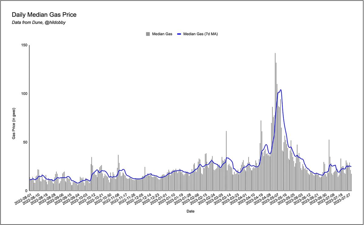 - 从历史上看,这个值主要设置在 1 以上,这表示排序器正在额外收费以维持 L1 结算 Gas 缓冲区。