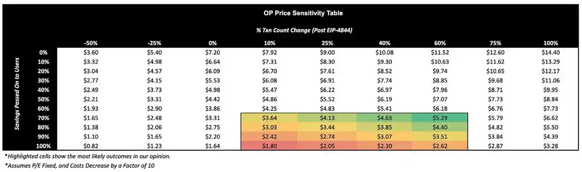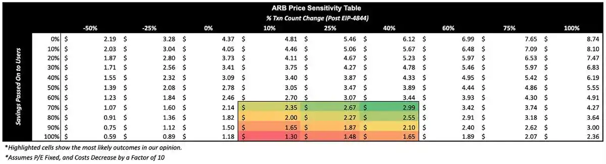 我们可以计算出这些变化对 ARB 和 OP 价格的影响。例如,如果 Tx 量增长了 40%,并且只有 90% 的费用节省传递给用户,那么 ARB 的价格将为 2.10 美元。