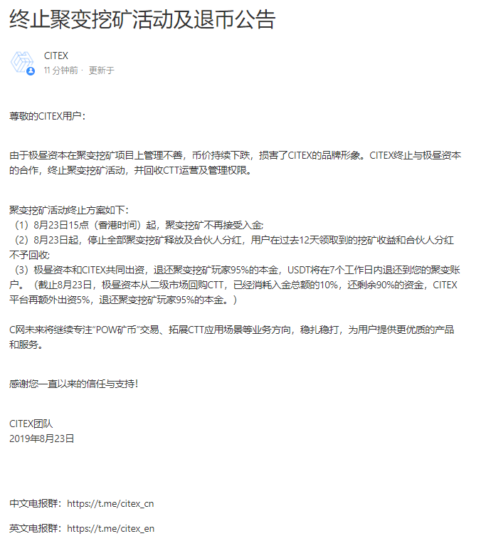 交易所 Citex 联合创始人刘晓东今日在朋友圈宣布「C 网决定停掉聚变挖矿。不然 C 网都要搭进去。」随后,Citex 官网发布公告,确认终止聚变挖矿活动及退币。