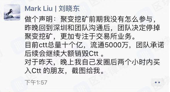 昨日晚间 9 点 50 分,刘晓东在朋友圈留言「能砸穿算我输」,疑似已经预见到 CTT 将会遇到砸盘。