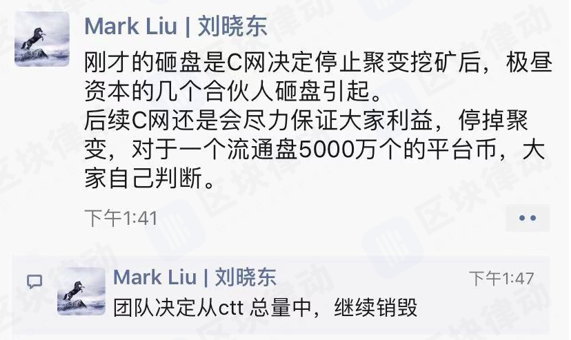 在发布该公告后,Citex 代币 CTT 开始暴跌疑似被砸盘。对于暴跌,刘晓东在朋友圈评论认为是砸盘是由极昼资本的几位合伙人操作,并表示认为为了保证大家利益,仍然需要暂停骤变挖矿。