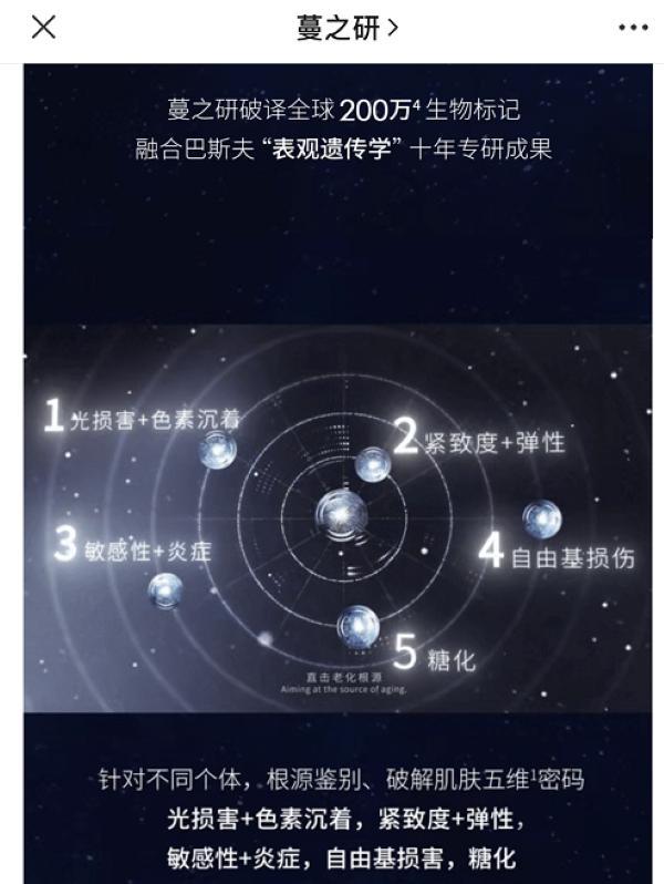 记者注意到,“蔓之研”官方微信公众号2020年12月17日发布的“告别盲目,定向护肤,从蔓之研Skin DNA源液开始”一文宣称,蔓之研Skin DNA能量源液系列的5款产品可以降低黑色素细胞含量34%、使最大皱纹深度减少15%、炎症因子的产生降低60%、细胞膜被氧化减少34%、皮肤紧致度提升58%,数据来源于巴斯夫美容护理中心(法国公司)。