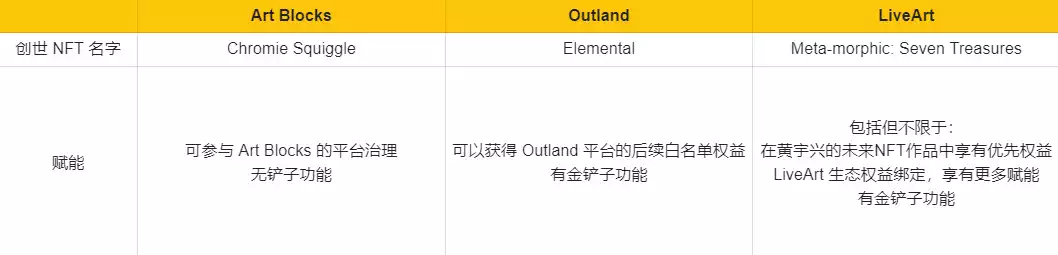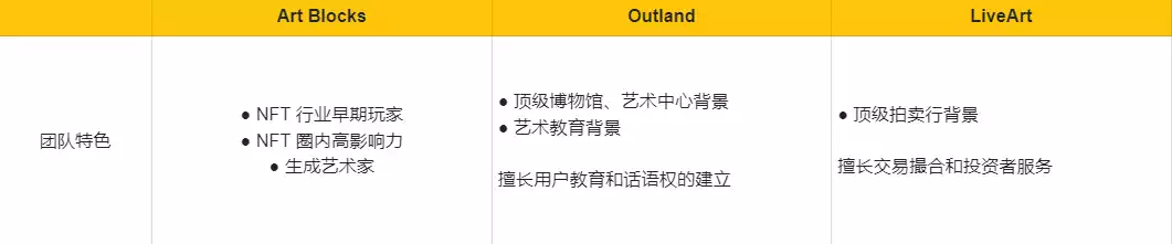 小结: 1、Art Blocks 与 Outland 和 LiveArt 不同,其本身就是 Web3 的语境中成长起来的艺术策展平台,所以当其取得了区块链上业务的极大成功后,想要扩大受众,就必然要走线下策展和上拍卖行的流程,这也是 Art Block 一直在耕耘的方向。而 Outland 和 LiveArt 都是从传统艺术品行业向 Web3 转型的团队,自身就带着丰富的艺术行业资源和光环,所以两者合作的都是顶级的艺术家,都要将传统领域的经验、能力、用户和资源向 Web3 迁移以及融合。