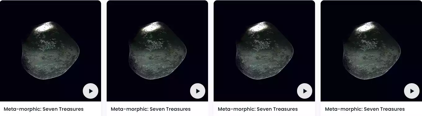 LiveArt 虽然 Liveart 平台一直有进行 NFT 的策展和孵化,但是真正第一个意义上的大师级创世作品,是近期推出的黄宇兴老师的曜变之石 Meta-morphic: Seven Treasures,该作品通过 3D 设计和加密算法生成,每一颗曜变之石 NFT 都是一块漂浮在多维空间的宝石,形态各异且各具内涵。