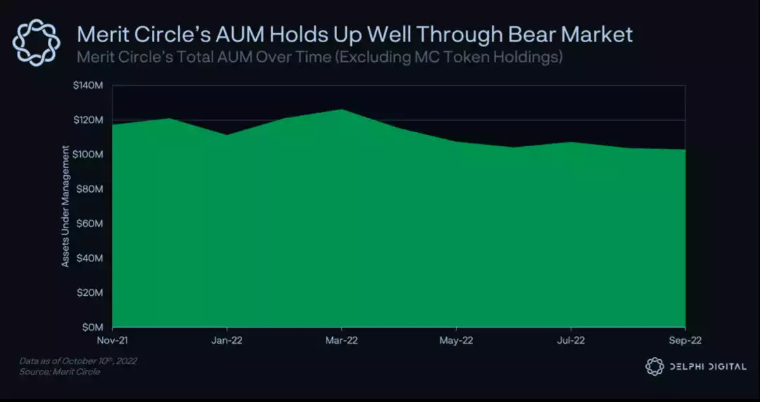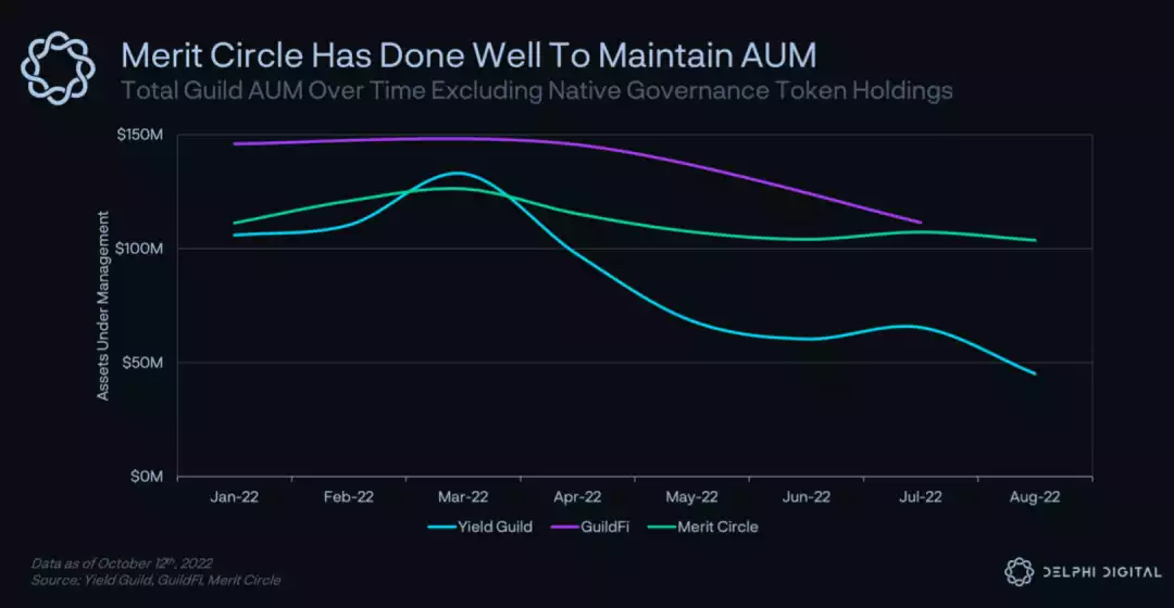 在上面的图表中,我们得到了 Yield Guild 在一段时间内的总资产管理规模(不包括其财政库持有的 YGG)。正如你所料,随着时间的推移,总价值明显低于包含 Token 的价值。有趣的是,与去年 12 月创下的 1.69 亿美元历史新高相比,估值仍然大幅下降了。目前,Yield Guild 的总资产管理规模约为 4500 万美元,已缩水了 73.3%。这意味着,不仅 Yield Guild 持有的 YGG Token 遭受了巨大损失,而且他们的 NFT 以及其他 Token 投资也遭受了巨大损失。与此形成对比的是 Merit Circle,其总资产管理规模相当可观,正如我们在报告中进一步强调的那样。