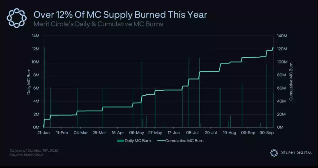正如你在两个图表中看到的那样,回购量和销毁量相当零星,但它们开始减少 MC 的供应。MC Token 回购总数(上图)接近 500 万。总 MC 燃烧数(下图)接近 1.2 亿。这相当于迄今为止购买或燃烧的全部稀释供应量的 12.5%。尽管这是一个有形的数额,但净流通供应在同一时期内有所增加。除非 Merit Circle 的收入大幅增加,导致更多的回购以及燃烧,否则 MC 在可预见的未来仍将保持通胀的状态。