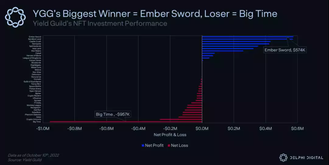 Yield Guild 目前表现最好的 NFT 投资是 Ember Sword。与 Merit Circle 相反,Big Time 实际上是 Yield Guild 表现最差的 NFT 投资。
