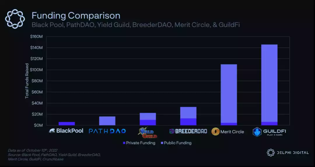 今年游戏公会的总资产管理规模普遍受到打击,Yield Guild、GuildFi 以及 Merit Circle 分别下降了 57.3%、23.6% 以及 7.5%。尽管市场条件不利,Merit Circle 仍将其 AUM 保持在令人印象深刻的水平。值得一提的是,Yield Guild 是唯一一家在 AUM 上比他们最初融资获得的资金更高的 crypto 游戏公会(尽管今年迄今其回撤百分比是最大的)。更多关于融资的信息看下图。