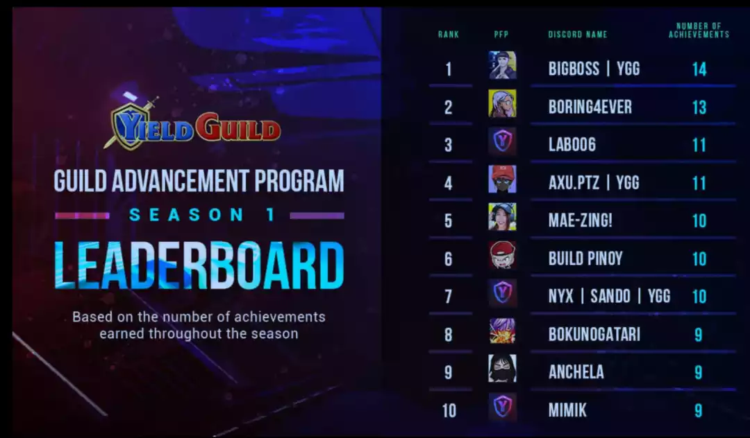 Yield Guild 是向电子竞技游戏迈进的几个公会之一。如下图所示的排行榜展示了高成就的公会成员,以期促进公会内部的良性竞争。