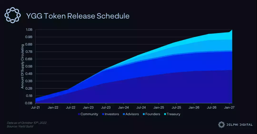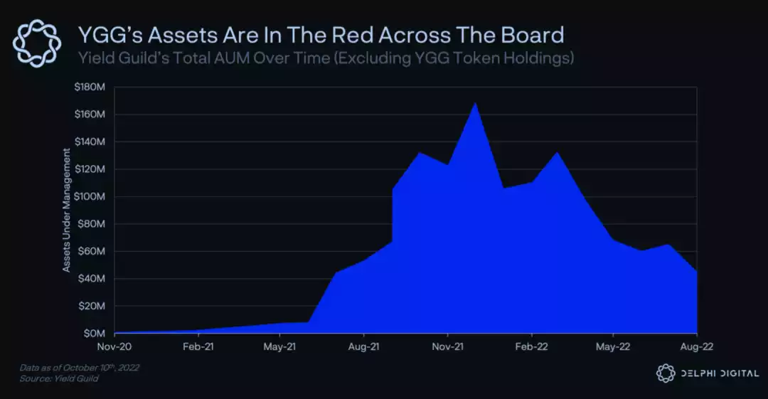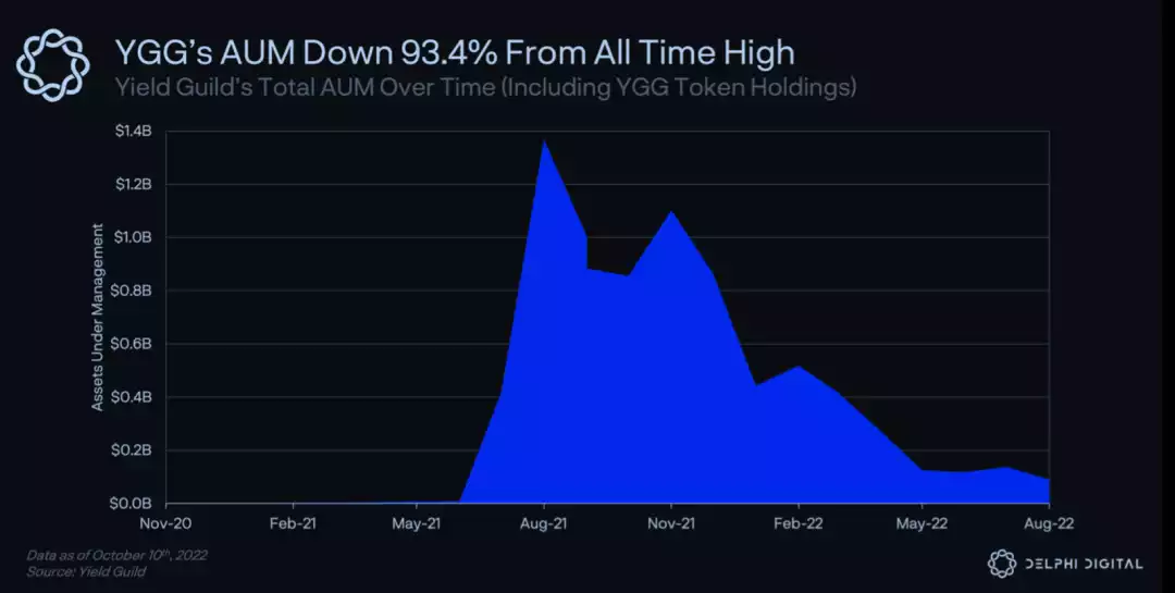 这当然是在 YGG 在发布后大幅增值的背景下。然而,在上升过程中对总 AUM 值的积极影响,在下降过程中会成比例地变为负面影响。随着 YGG Token 从历史最高点下跌 96.9%,Yield Guild 的总资产管理规模也从最高点下跌了 93.4%,这并不令人意外。