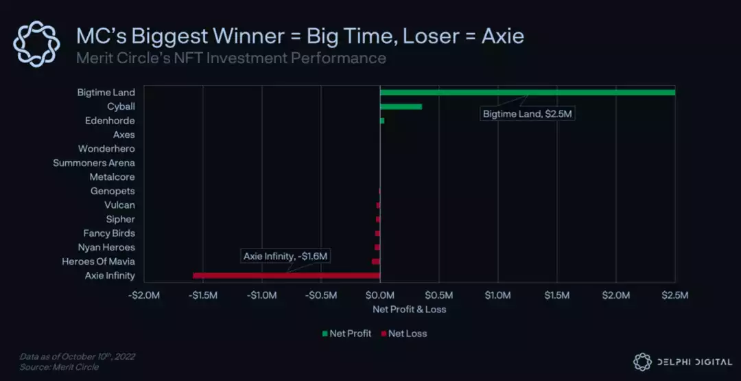 可视化后,Merit Circle 的 NFT 投资表现似乎体现了帕累托原理。大部分的总利润和损失可以归因于少数投资。在这种情况下,Merit Circle 的最大赢家是 Big Time 土地。同样,Merit Circle 的大部分亏损可归因于少数投资。在这种情况下,罪魁祸首是 Axie Infinity。