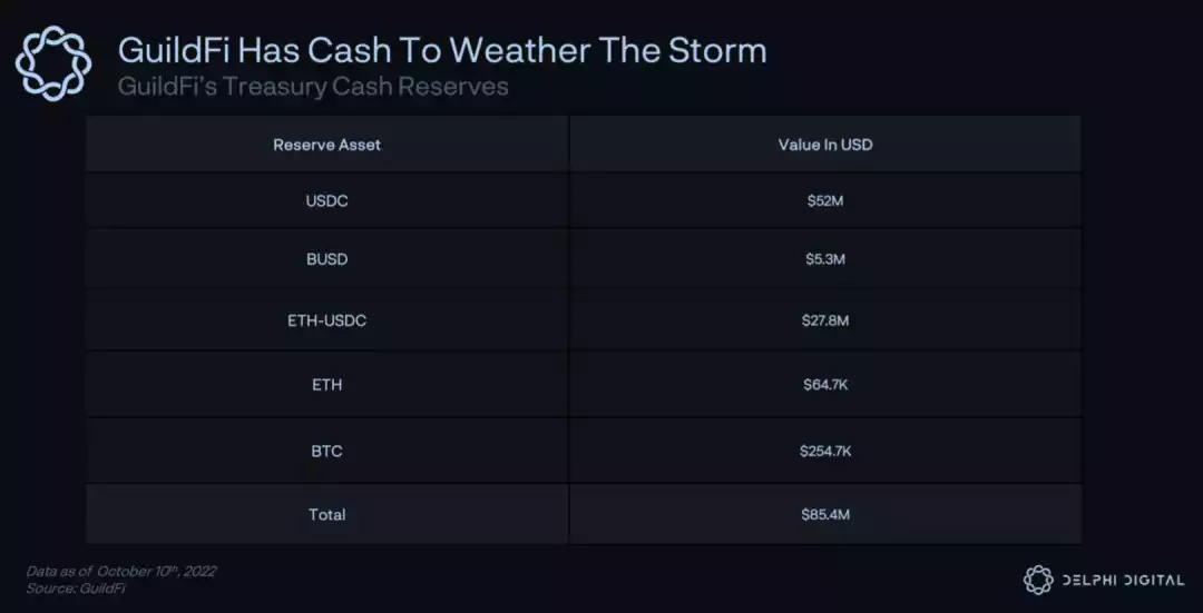 GuildFi 的财政库在本报告中的所有公会中拥有最大的现金头寸。这不包括其他持有的 token、种子投资以及 NFT,其财政库的现金总价值约为 8540 万美元。鉴于当前的熊市,如此可观的金额显然对公会来说是一个切实的优势。