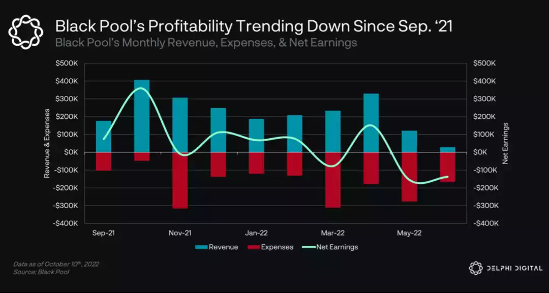 与 Yield Guild 类似,BlackPool 的收益看起来很糟糕。自 21 年 10 月以来,该公会的月净收入一直呈下降趋势。最值得注意的是,第二季度的最后一个月是 BlackPool 有史以来最糟糕的净收益月。