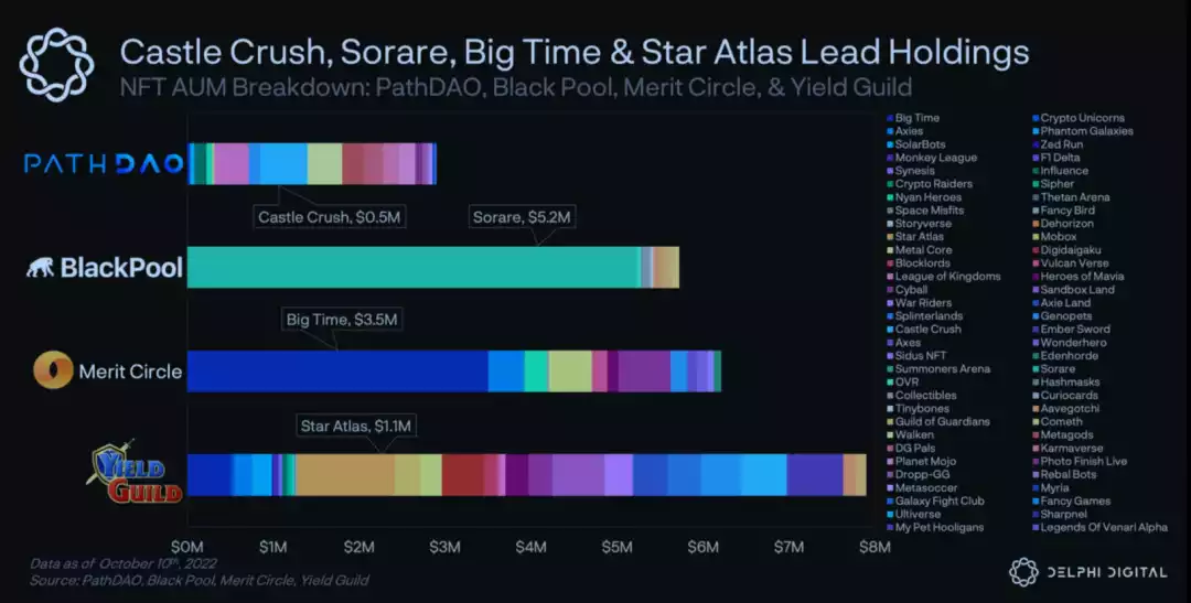 将当前公会 NFT AUM(上图)与近一年前(下图)进行比较,我们可以得出一些有趣的观察结果。最明显的两个公会是 BlackPool 和 Yield Guild——坦率地说,它们都很糟糕。自从我们上次观察以来,这两个公会的 NFT 投资组合都受到了打击。