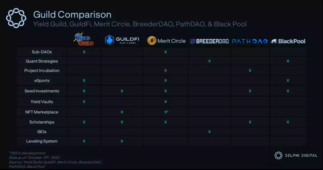 这些公会有一些共同的基本特征。在实际意义上,公会是一组围绕共同利益、价值观和目标而组成的个人,以实现成员的共同利益。在 crypto 游戏行业,游戏显然是他们的重点。它们的不同之处在于采用的具体特征和策略——上表列出了其中的一些。