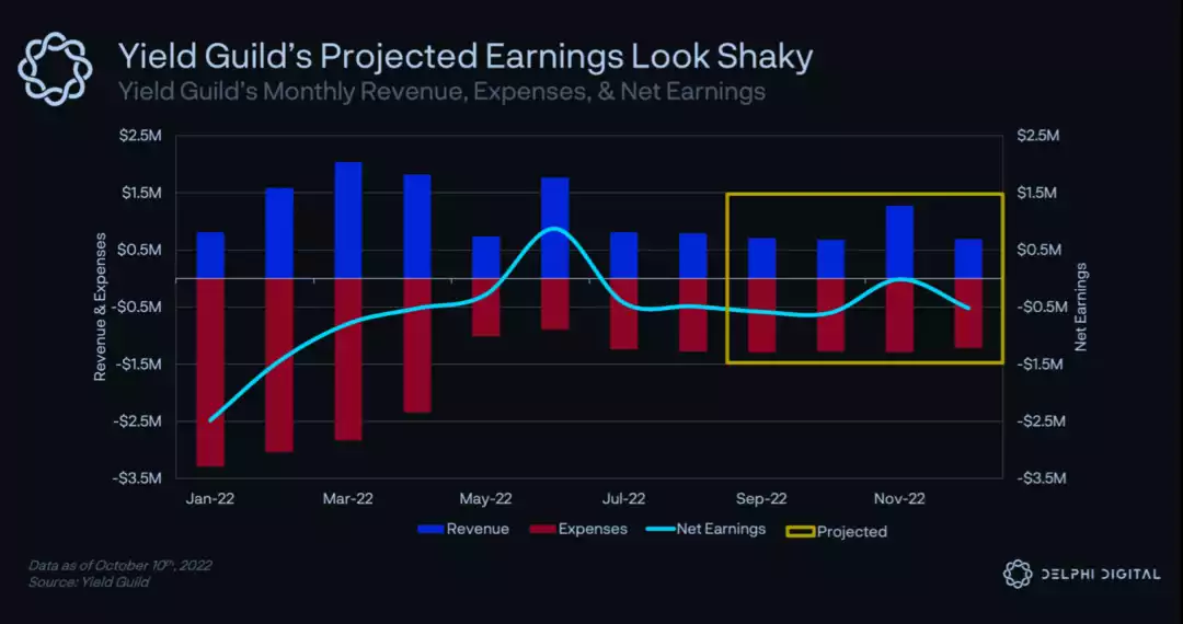 尽管 Yield Guild 在整个 2022 年上半年的净盈利能力都在提高,但其目前的收益并没有描绘出健康和繁荣的画面。除 22 年 6 月外,今年没有其他月份对该公会而言是净盈利的。Yield Guild 对年底前的前瞻性收益预测也没有多少缓解的希望。充其量,这可以被解释为经济放缓,导致净利润率停滞不前。最坏的情况是,该公会可能会在新的一年里看到利润持续下降。这无疑会使 Yield Guild 公会当前策略的可行性受到质疑。