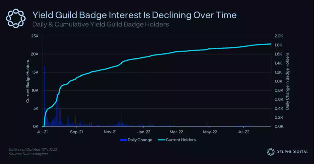 如上图所示,Yield Guild 管理的总资产价值因 YGG 在 21 年 7 月的 Token 推出而得到显着提升。