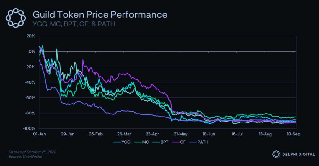 对于 crypto 投资者来说,在 2022 年持有游戏公会 Token 会是一件非常痛苦的事。本报告中比较的每个 Token 在今年都下跌了 80% 以上。当然,最近很多 crypto 子领域都受到了沉重打击,但与游戏相关的Token已经感受到了无情熊市的全部愤怒。它引出了这样一个问题:在缺乏超增长的 P2E 游戏的情况下,crypto 游戏公会是否具有产品市场契合度?