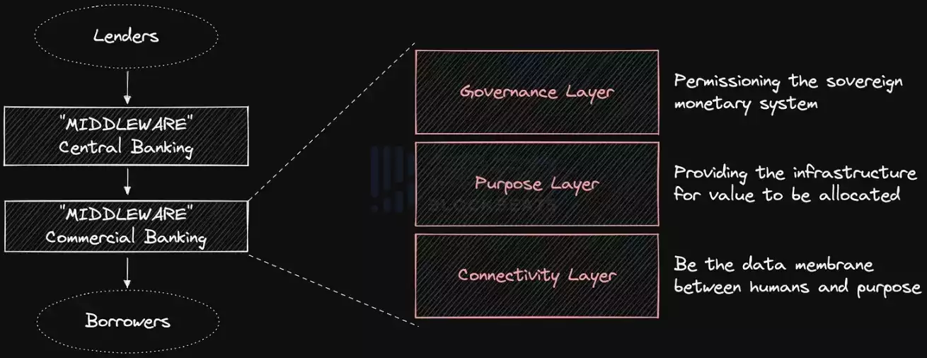 货币中间件可以在哲学上分解为三个不同层的组合:治理 - 在其中决定什么可以到来并与中间件交互,目的 - 代表通过其管理价值的基础设施,以及连接 - 构成连接用户和基础设施的前端。