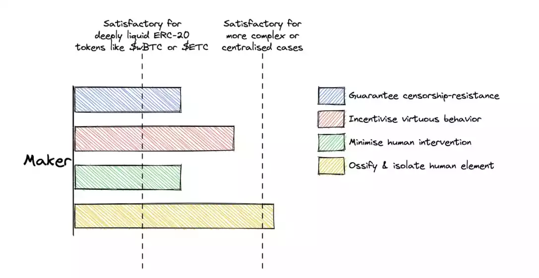 审查 - 抵抗:Maker 实际上将控制权集中在创始团队手中激励善行:许可决定 ( 即这种抵押品具有在制造者处打开保险库所需的特征 ) 和融资决定 ( 即协议将隐含地为这种抵押品提供资金并将风险社会化 ) 相结合,当再加上不令人满意的审查 - 抵抗时,接受任何比 $ETH 和 $BTC 更复杂的东西是非常危险的人为最小化:尽管 Maker 仍然严重依赖人类来开发 ( 例如监控风险参数、提供新的抵押品 ) 和运行 ( 例如管理预言机和清算引擎 ) 协议,但人类的足迹在某种程度上足够透明,让那些与协议交互的人能得出他们自己的结论隔离人的因素:任何有头脑的人都能看到协议在哪里止步,谁在做出根本决策,谁在推动冒险和管理决策