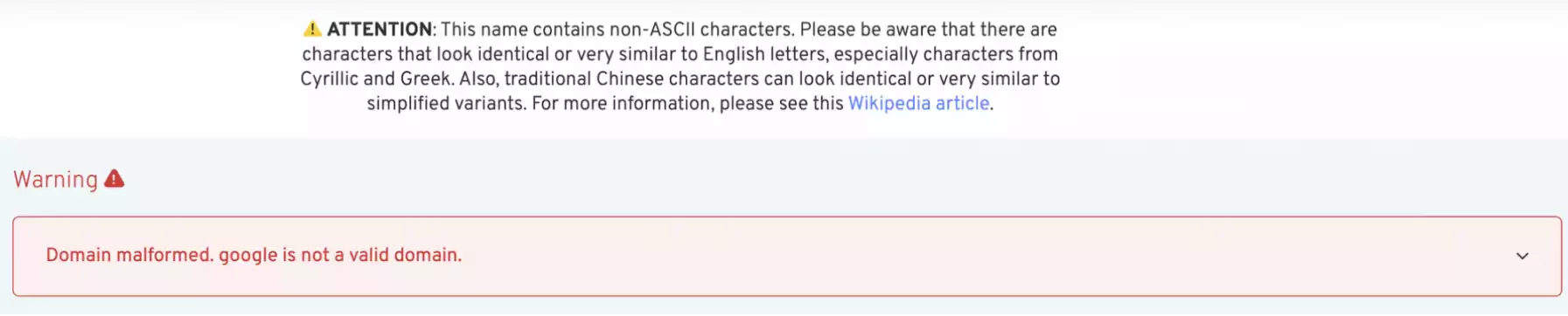 目前 ENS 官网已经对特殊字符进行过滤,并给予必要的警告提示(但是合约本身并没有限制,所以科学家一样可以通过合约进行注册)