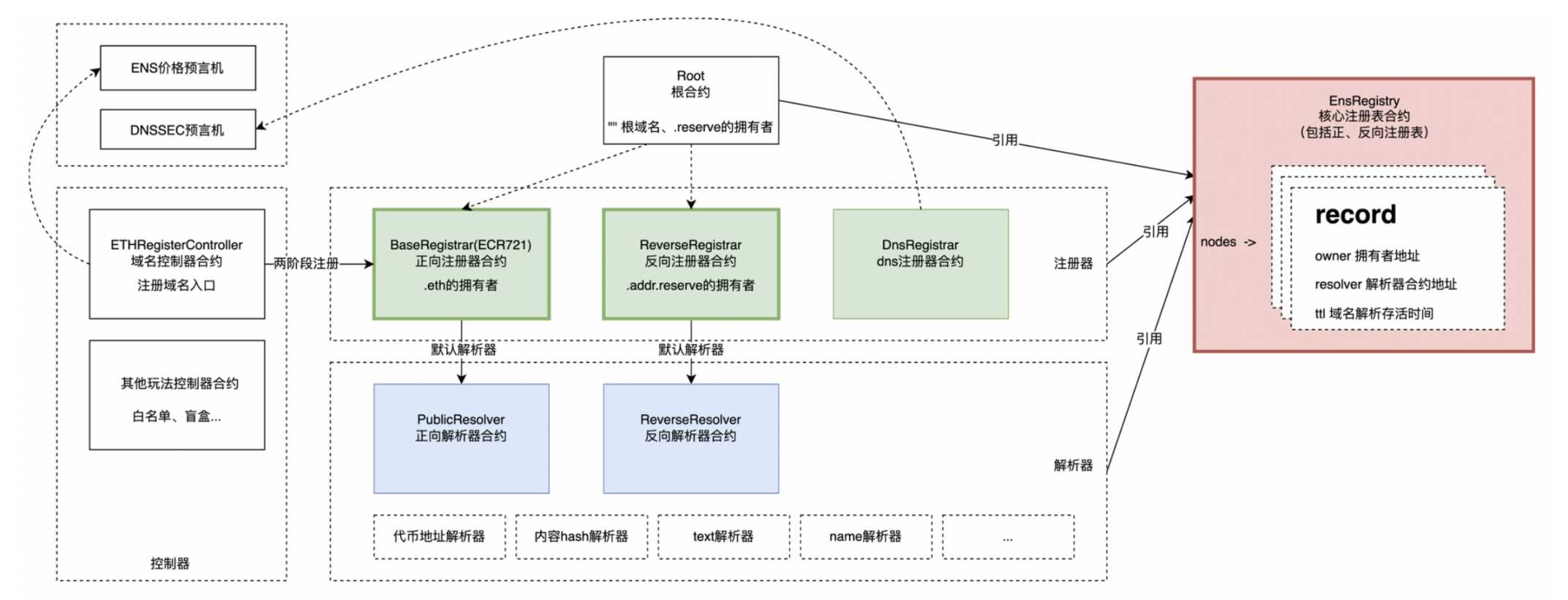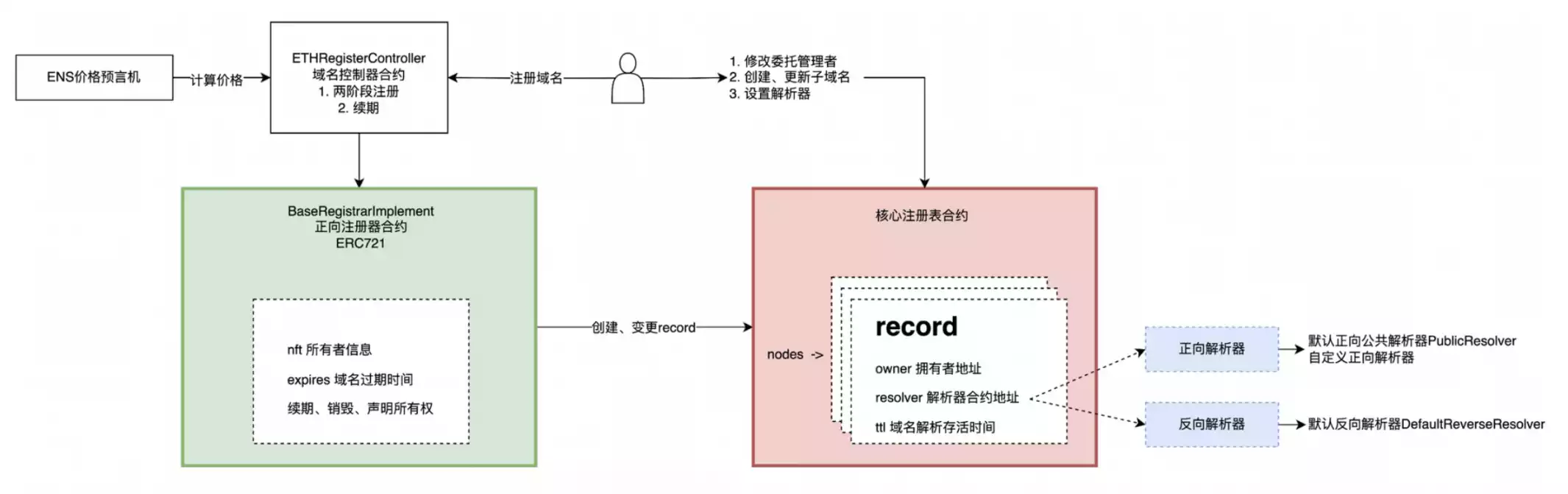 注册器合约(绿色部分):负责分配名称的合约,有正向注册器,反向注册器,DNS 注册器。