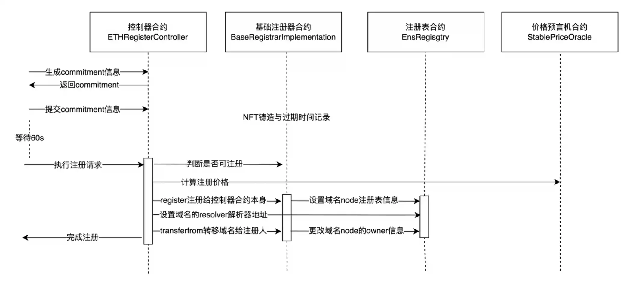 ENS 注册采用「请求 - 提交」两阶段注册模式 ENS 注册采用「请求 - 提交」两阶段注册模式,为什么需要两阶段提交?我们知道以太坊节点从交易池 pool 中捞取交易是会按照交易给的 gas 费进行优先级排序;在注册者携带待注册域名构造的交易提交上链前,在整个网络是公开透明的,恶意的攻击者可以监听并解析此类待上链交易,并构造相同域名的注册交易,通过提高 gas 费的方式抢先上链注册控制器合约注册。