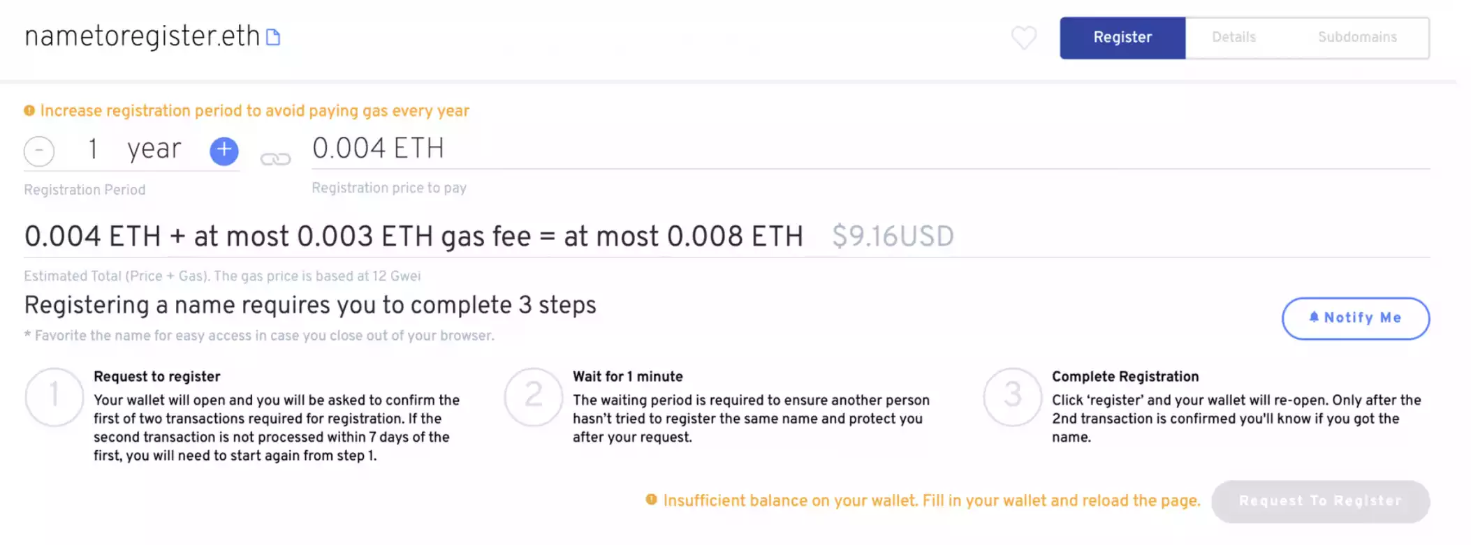 用户在官网中,将要注册的域名等注册信息传给控制器合约,控制器合约通过预言机计算该域名的价格,同时将域名通过 namehash 转成 node 后传给基础注册器进行域名 NFT 的注册,同时将域名相关注册表信息写入注册表合约完成注册,同时域名的 owner 可以在官网通过注册表合约进行管理操作,官网中的注册页面如下: