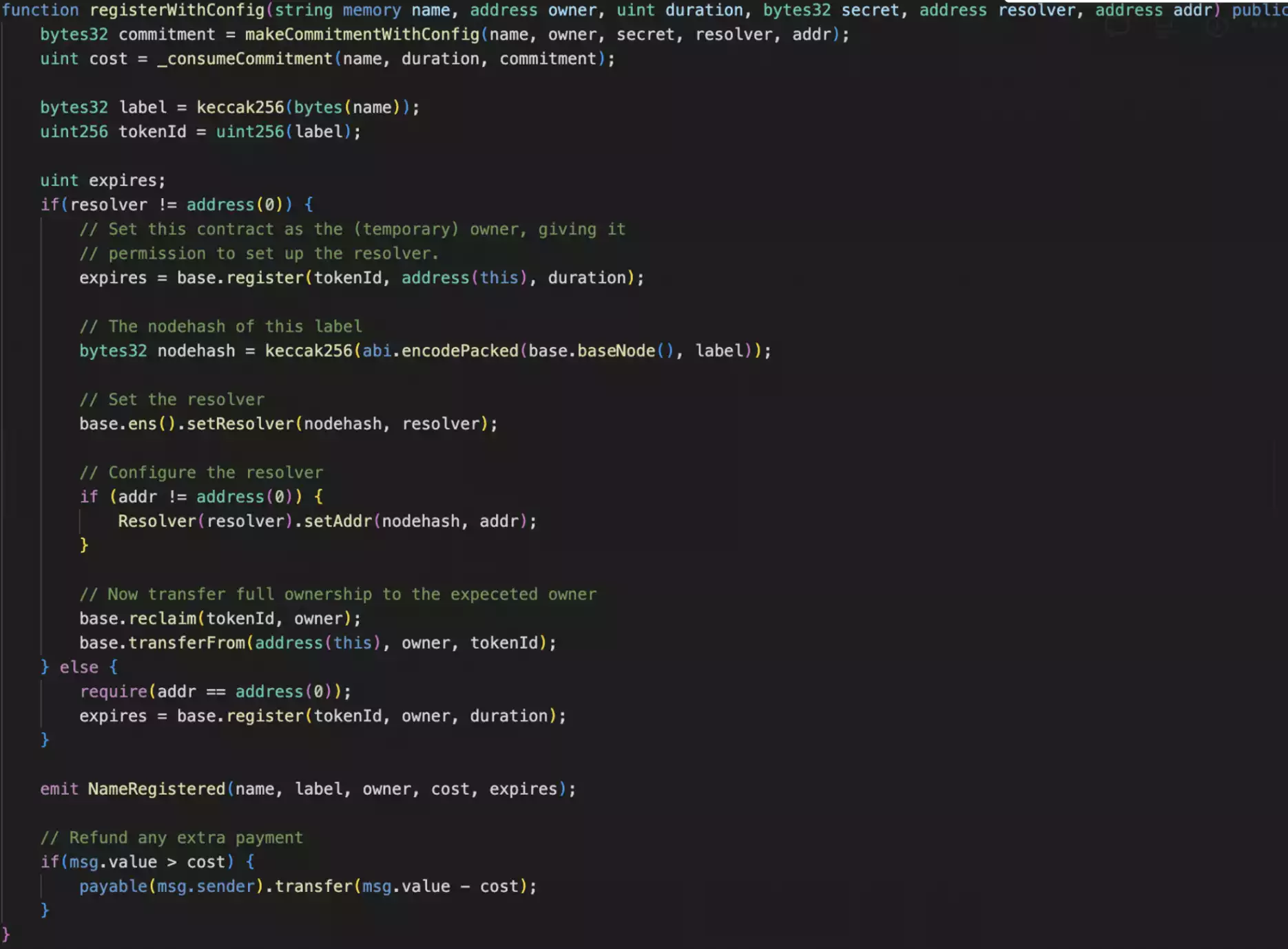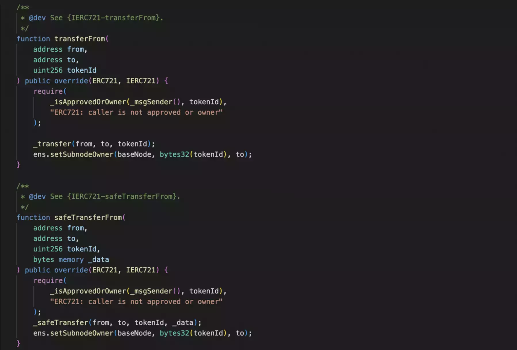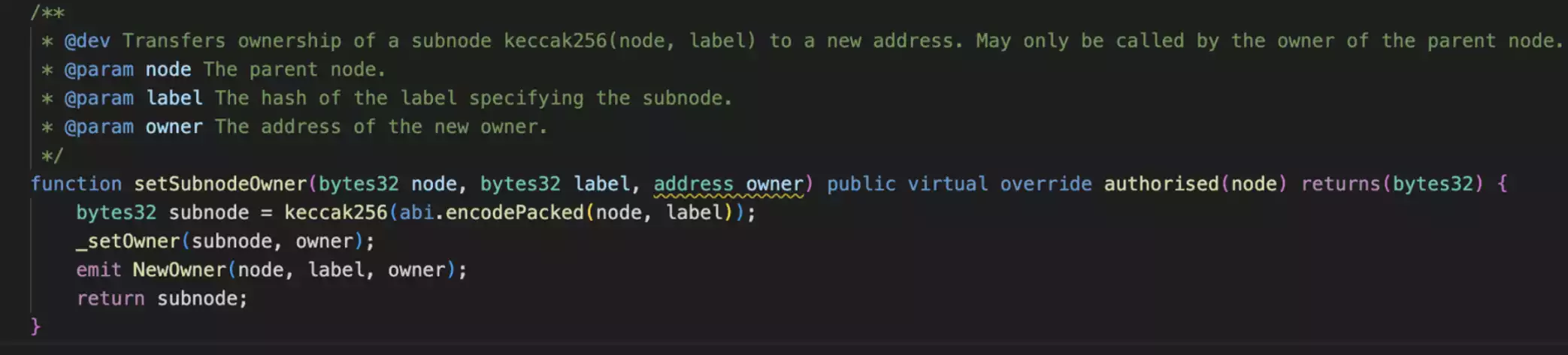 2、transfer 问题:我们可以在基础注册器里复写 transferFrom 和 saveTransferFrom 函数,在转移 nft 的同时调用 setSubnodeOwner 转移 owner。