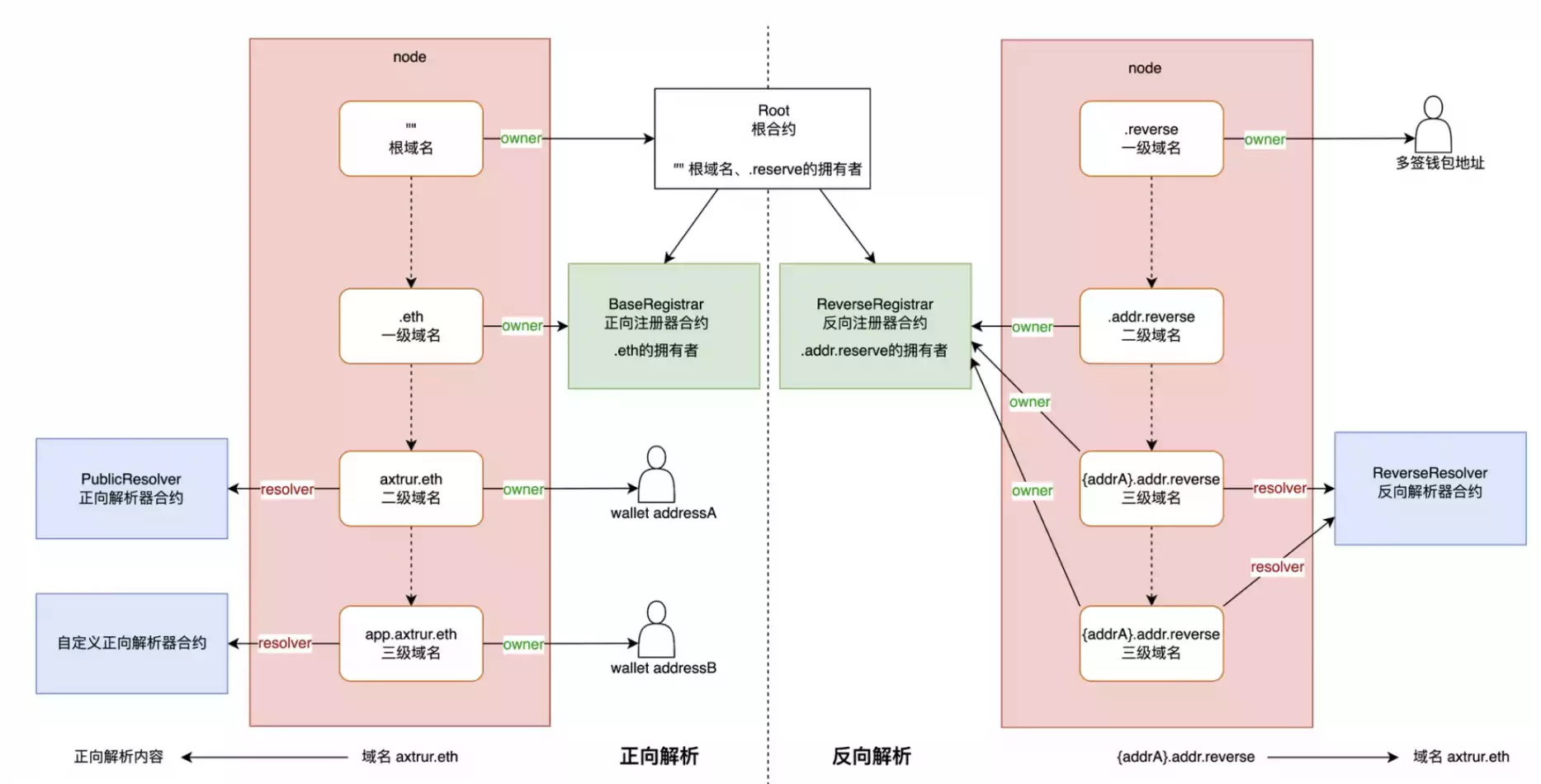 反向解析(主网上有默认的反向解析器合约):负责记录钱包地址所绑定的域名,即反向域名的 nameNode(比如 {{钱包地址}}.addr.reverse) 到 域名名称的解析