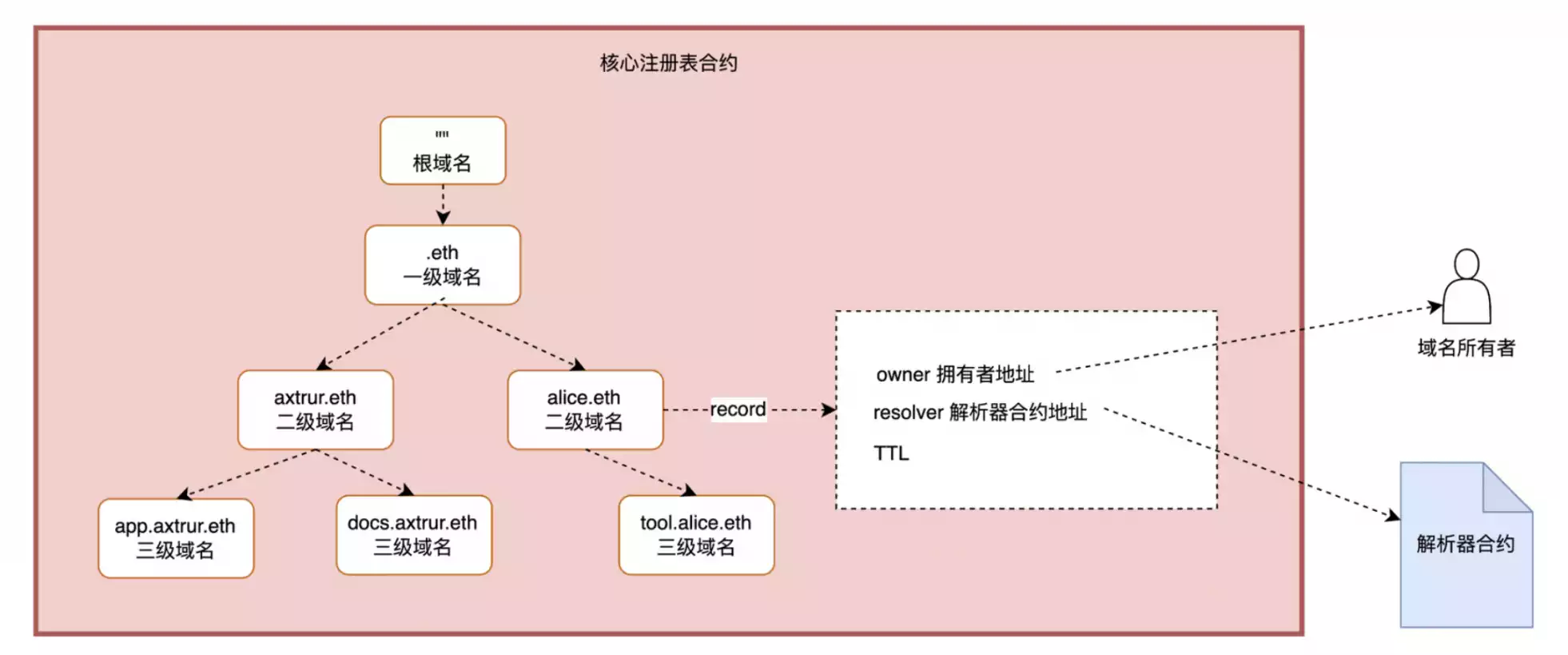 在 ens 中,用户注册的域名比如 axtrur.eth,会采用 namehash 算法生成的哈希 node 去记录链上数据,后文中我们将提到的 node 理解为一个域名名称比如 axtrur 即可,关于 ENS 名称的处理请参考 https://ensuser.com/docs/contract-api-reference/name-processing.html