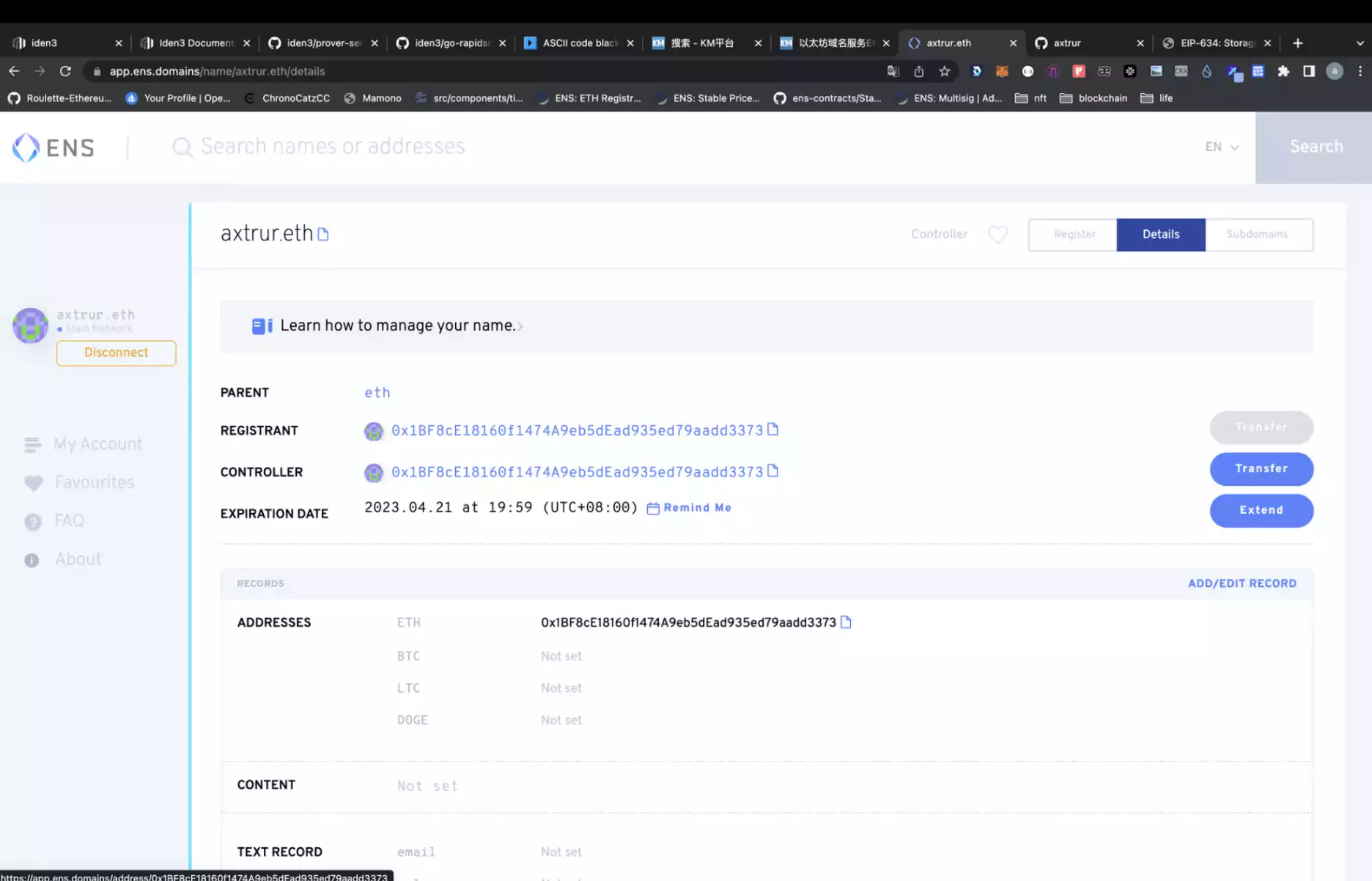 3、transfer 问题:ENS 目前有个比较麻烦的问题就是域名 NFT 在转移的时候,owner 没有同步转移,所以当你在交易市场买了一个 ENS 域名 NFT 的时候,你需要通过基础注册器合约的 reclaim 接口,消耗一定的 gas 费声明 NFT 所有权后,才能到 ens 官网上看到自己拥有的域。