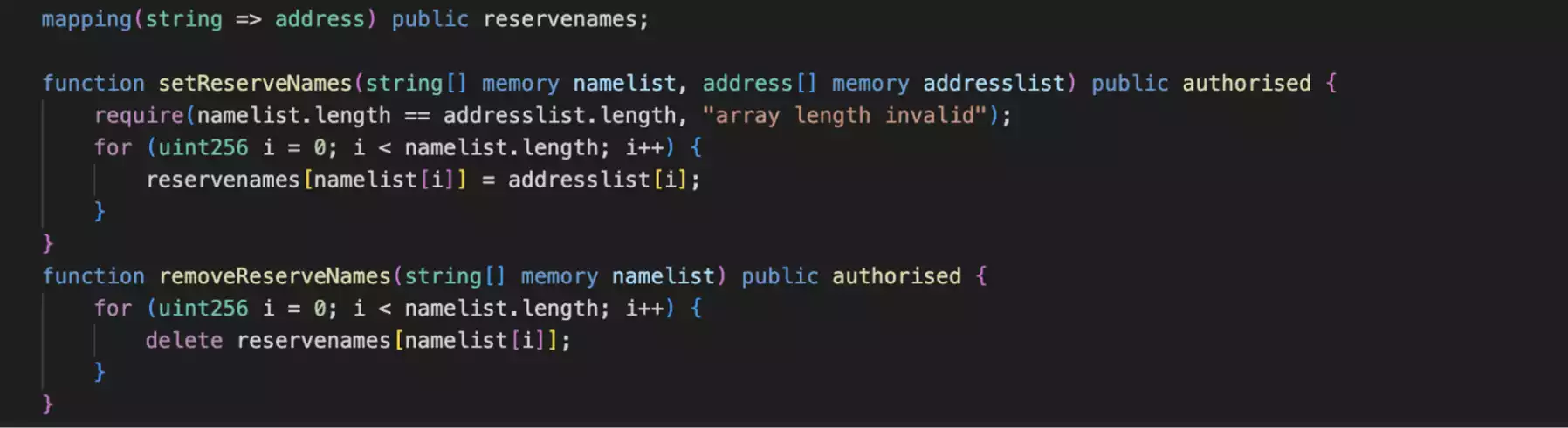 4、保留字问题:可以将保留字以及对应要保留的钱包地址上链,先保留给合约本身,后面可以通过 apply 接口申请给某个特定地址。