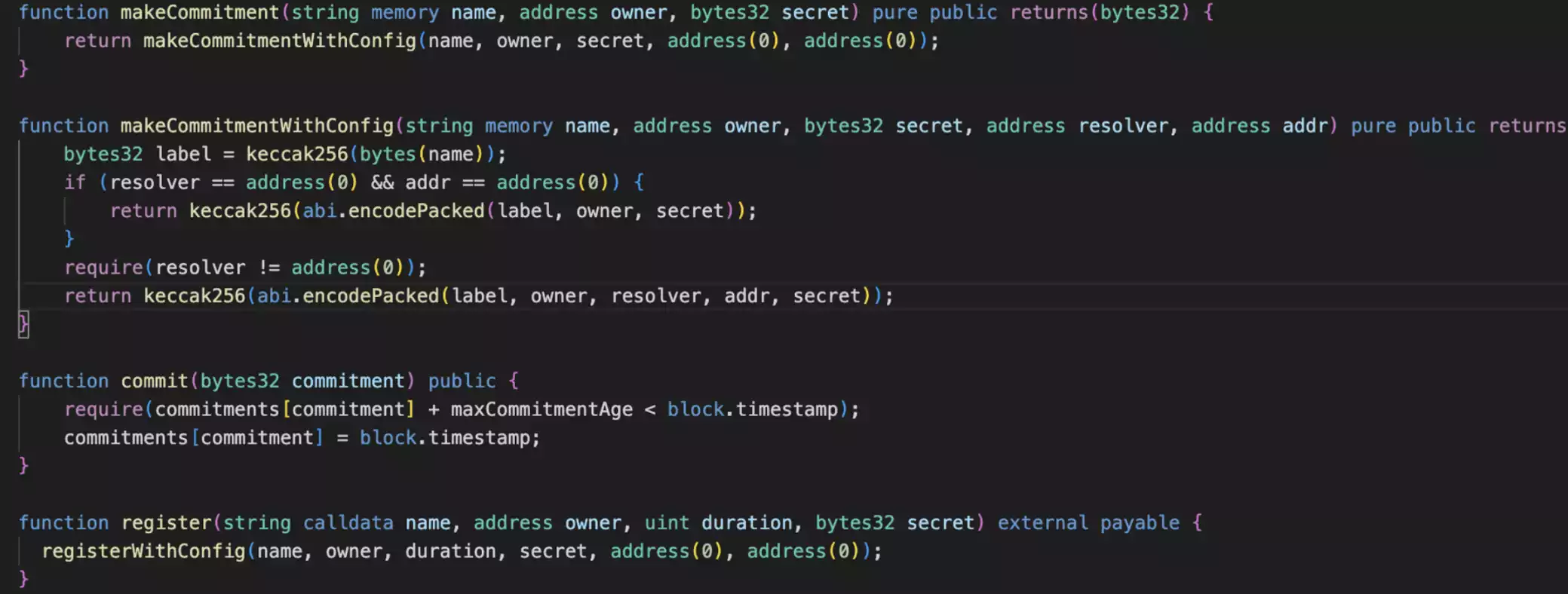 makeCommitment 接口根据待申请域名 name、待申请地址 owner、随机值 secret 进行哈希后生成一条特殊的 commitment 后,通过 commit 提交上链。