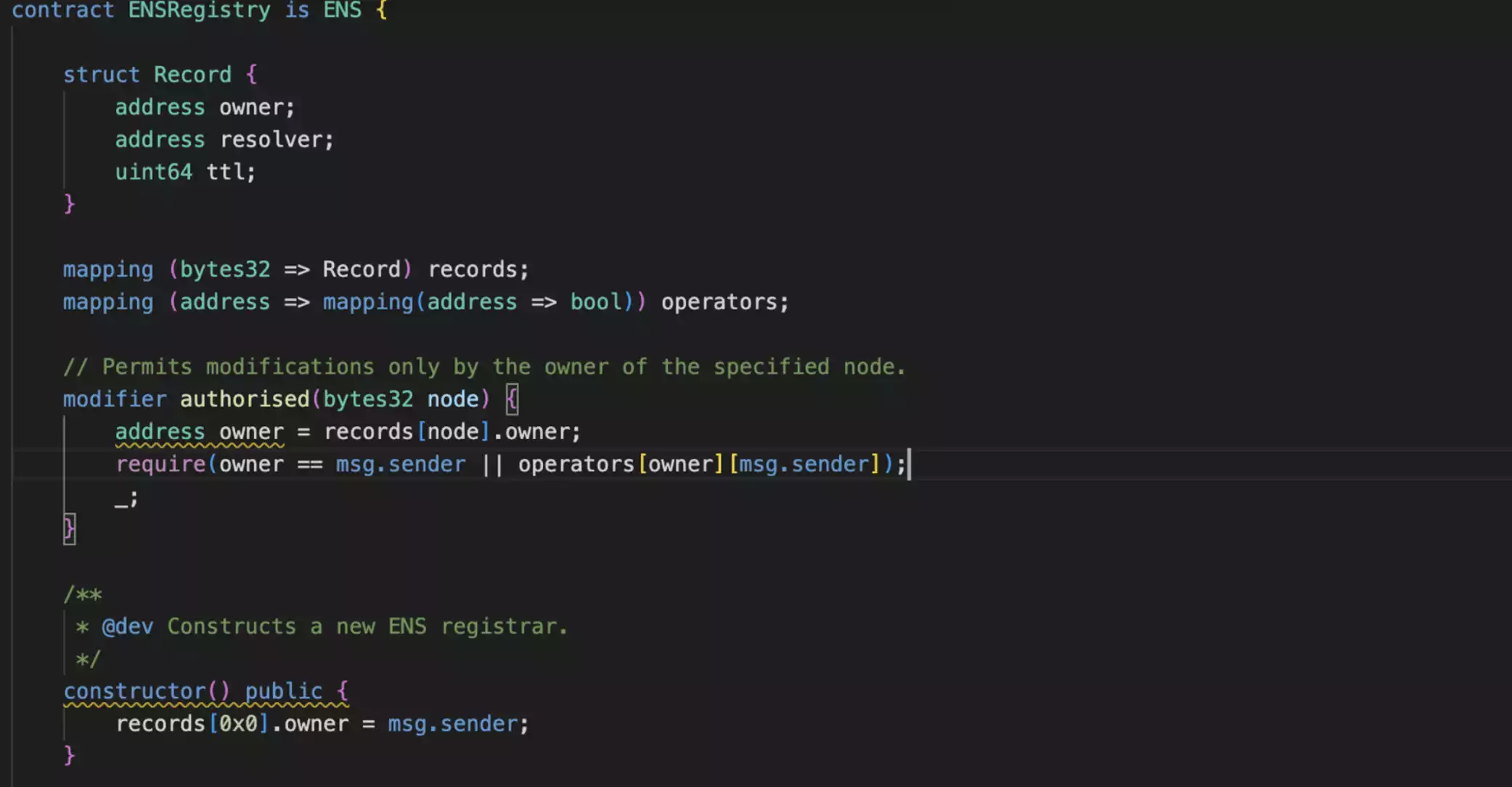除了注册表信息 records 维护,合约还维护 owner 的委托管理者信息 operators,owner 可以通过添加设置委托管理者地址(可以是用户地址,也可以是合约地址)来共同管理域名信息 合约中相关管理设置接口(比如设置解析器,ttl,以及创建和修改子域名),都会通过修饰器`authorised(node)`来限制调用权限;该修饰器将判断该接口的交易请求者是否为当前域名的 owner,或者委托管理者地址,保证了仅有域名的 owner 或委托者才有创建下一级子域名的权限。同时这里部署初始化的时候将`」」`根域名的 node 的 owner 设置为部署者,只有这样,部署者才能将根域名的 owner 设置给 Root 合约根合约。