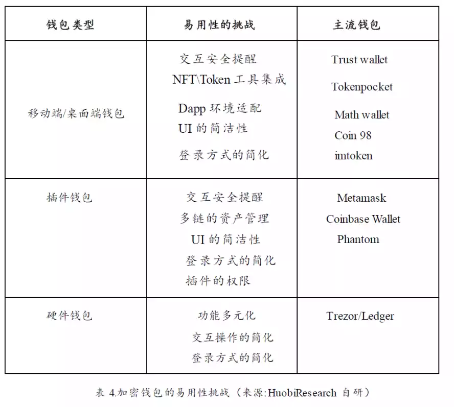 用户与钱包之间的交互体验目前对大部分钱包品牌来说较差,能够改进与完善的地方比较多,例如在插件端与手机端更人性化的交互防钓鱼(安全)提醒、更便捷与方便用户的的 NFT\Token 工具集成、更广泛适用的 Dapp 环境适配等(表 4)。除了交互体验以外,钱包的使用 / 登录方式 /UI 目前与 Web2 应用程序的使用也有一定的区别。正是由于去中心化钱包上述易用性不足,很多新老用户最终又选择了传统的中心化钱包。中心化钱包虽然存在一定的人为的安全风险,但它操作简单,用户界面友好,如果去中心化钱包想要获得更多的用户,就必须解决易用性问题。