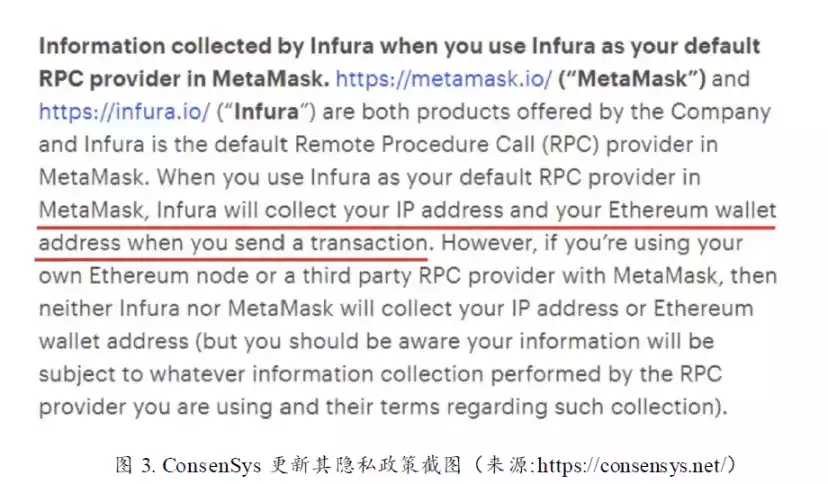近日,Metamask 的隐私收集事件终于将钱包隐私问题摆在了台前,先是区块链开发平台 Alchemy 在 10 月份更新隐私声明,称可能会自动收集 IP 地址、用户设置、MAC 地址、Cookie 标识符、移动运营商、浏览器或设备信息、位置信息、互联网服务提供商等个人信息,也可能会通过第三方服务和组织获取用户个人信息。而在 11 月 23 日,ConsenSys 的隐私政策更新使得各大社区与媒体引爆了钱包隐私的讨论。ConsenSys(MetaMask 和 Infura 的母公司)更新了其隐私政策,声明当用户在 MetaMask 中使用 Infura 作为默认 RPC 时,将在用户发送交易时收集对应的 IP 地址和 ETH 地址(图 3)。