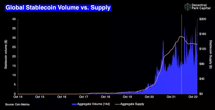 定义原因:2022 年,稳定币表明,即使在熊市期间,它们也实现了真正的产品市场契合。尽管发生了严重的去杠杆化事件和一级交易平台倒闭,我们还是看到了更高的交易量。更高的交易量与更低的供应量意味着更少的稳定币单位被更频繁地交易(更高的速度)。