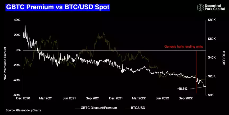 据透露,在 2022 年,大量 GBTC 股票被用作大型基金(例如 3AC)的抵押品,这些基金的价值从 2021 年 2 月的峰值下跌了 85%。在 Genesis 停止其贷款业务后,投资者担心 DCG/Genesis 可能会被迫出售 (6 亿至 8 亿美元的加密抵押品 ) 以筹集现金,因此折价扩大速度加快。事实是,这些事件只是加速了先前的折价趋势。