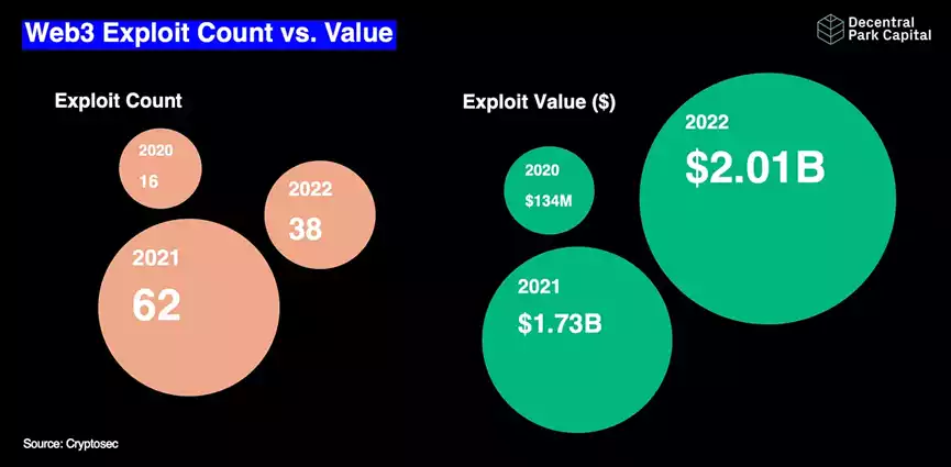 内容:自 2020 年以来,Web3 协议的漏洞被利用的总数量与美元总额。2022 年的漏洞利用总数下降了 39%,而利用的总量增长了 16%(20 亿美元)。