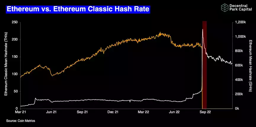 内容:自 2021 年 3 月以来,以太坊 1 的哈希率趋势与以太坊经典的哈希率趋势。红色区域表示 ETH 合并。