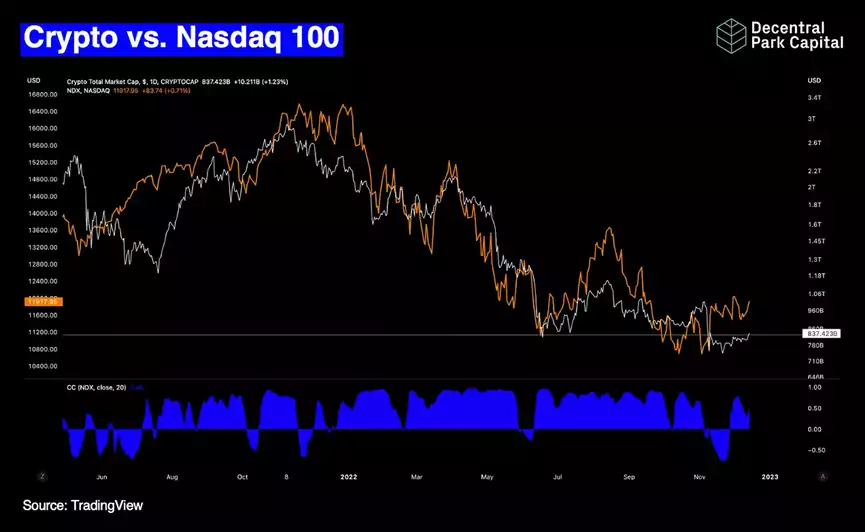 内容:在 2022 年的大部分时间里,加密货币市值与 NDQ 等成长型科技股指数呈正相关,但并不总是如此。