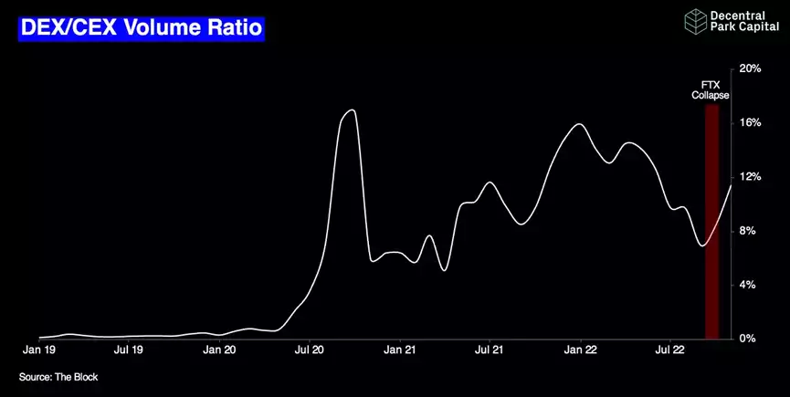 内容:全球去中心化交易平台交易量超过中心化交易平台,从 9 月的 9% 增长到 11 月的 11.7%。